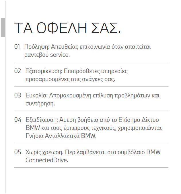 Για να επωφεληθείτε από όλα τα πλεονεκτήματα που προσφέρει το BMW Service θα χρειαστούμε τα στοιχεία επικοινωνίας σας. Βεβαιωθείτε ότι έχετε συναινέσει στη χρήση των προσωπικών δεδομένων σας και ότι έχετε αντιστοιχίσει την BMW σας και τον Εξουσιοδοτημένο Επισκευαστή με τον λογαριασμό ConnectedDrive. Έτσι η υπηρεσία του "Proactive Care" μπορεί να σας παρέχει ολοκληρωμένη και εξατομικευμένη υποστήριξη.